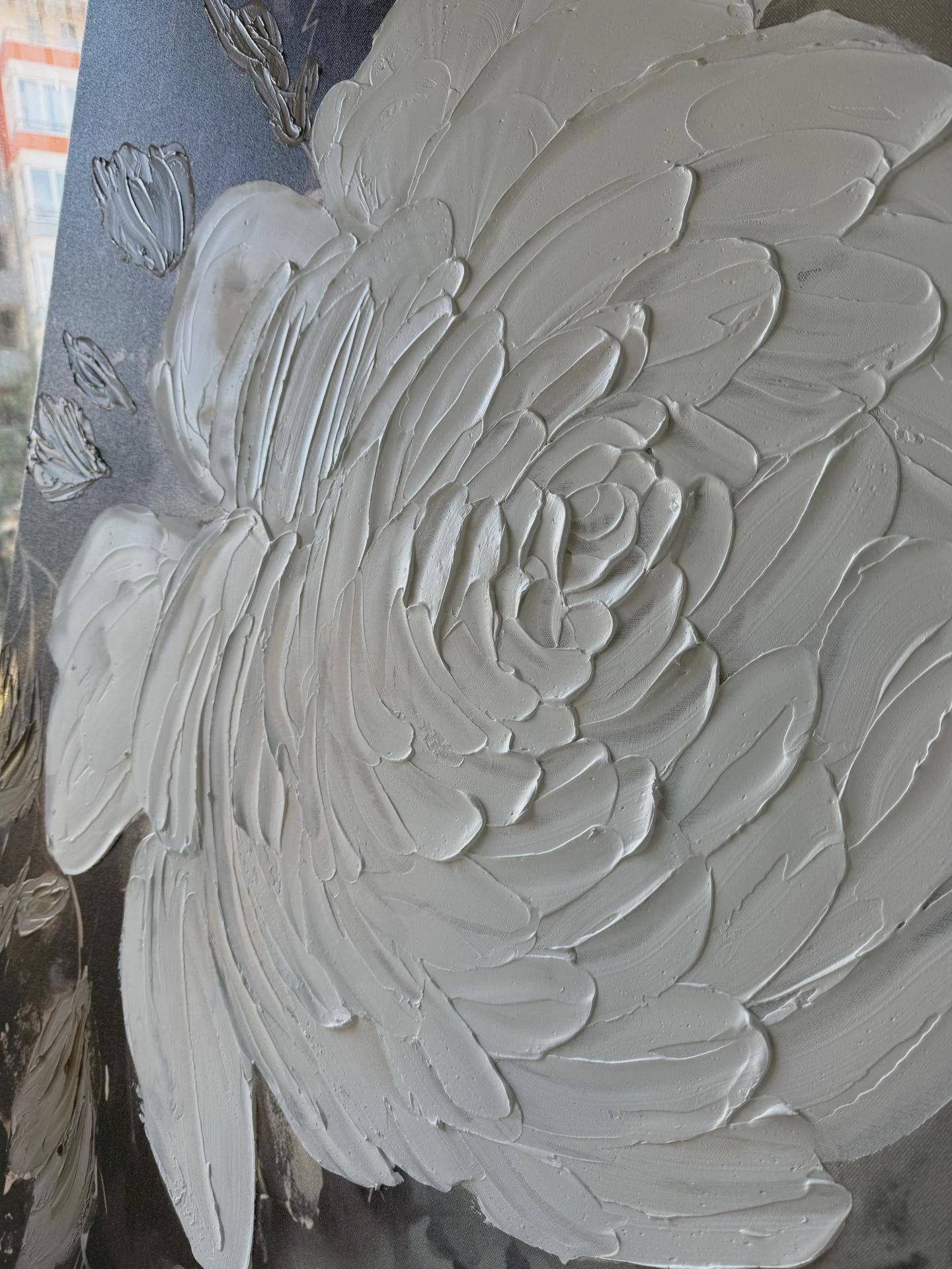 Textured Handmade Oil Paint Art White Flower, Black and White, Gray Floral Wall Art 70x100cm Wall Art, Home decor, Luxury decor, living room