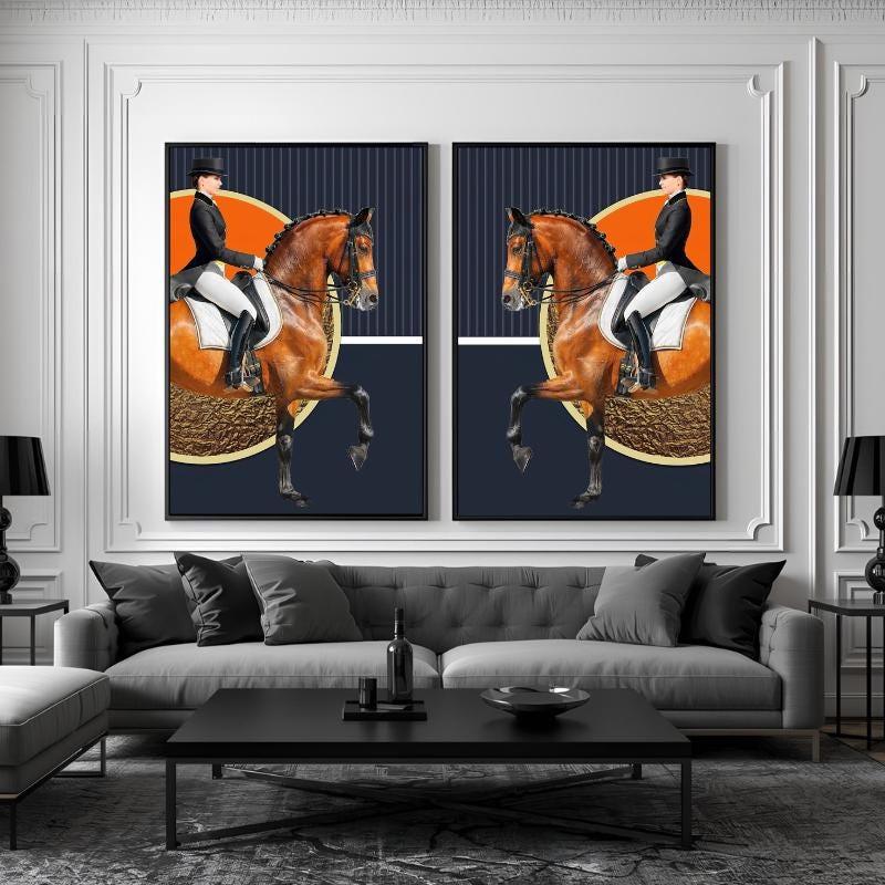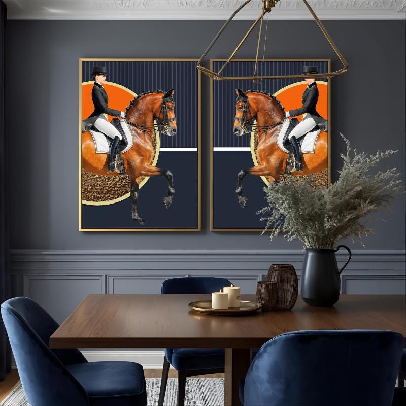Set of 2 Canvas, Modern Royal Horses Navy Blue and Orange Abstract Canvas Wall Art Poster Print,Nordic Scandinavian Ready To Hang